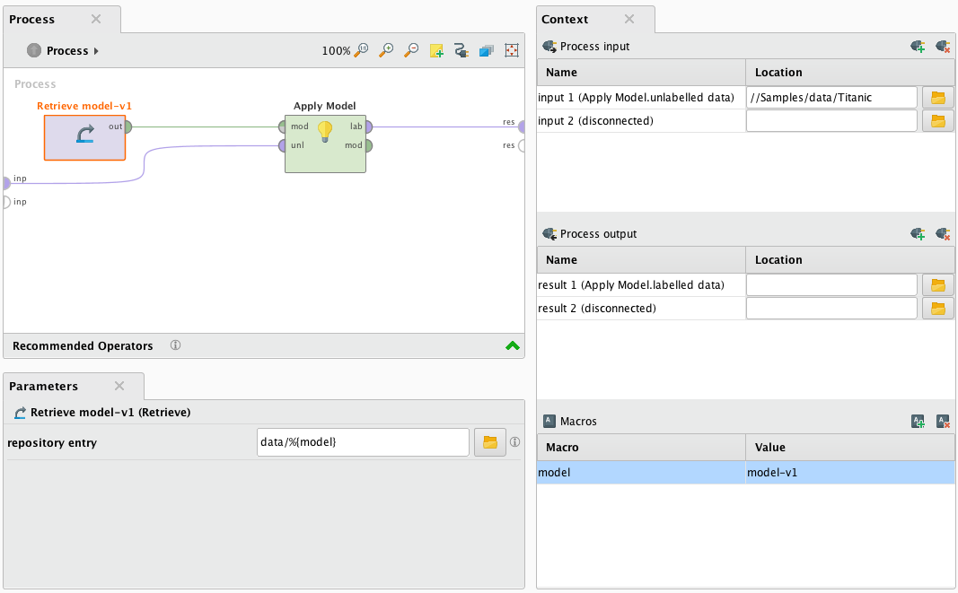 In the given example, a macro model is declared and used in the Retrieve Model operator to dynamically load a model.