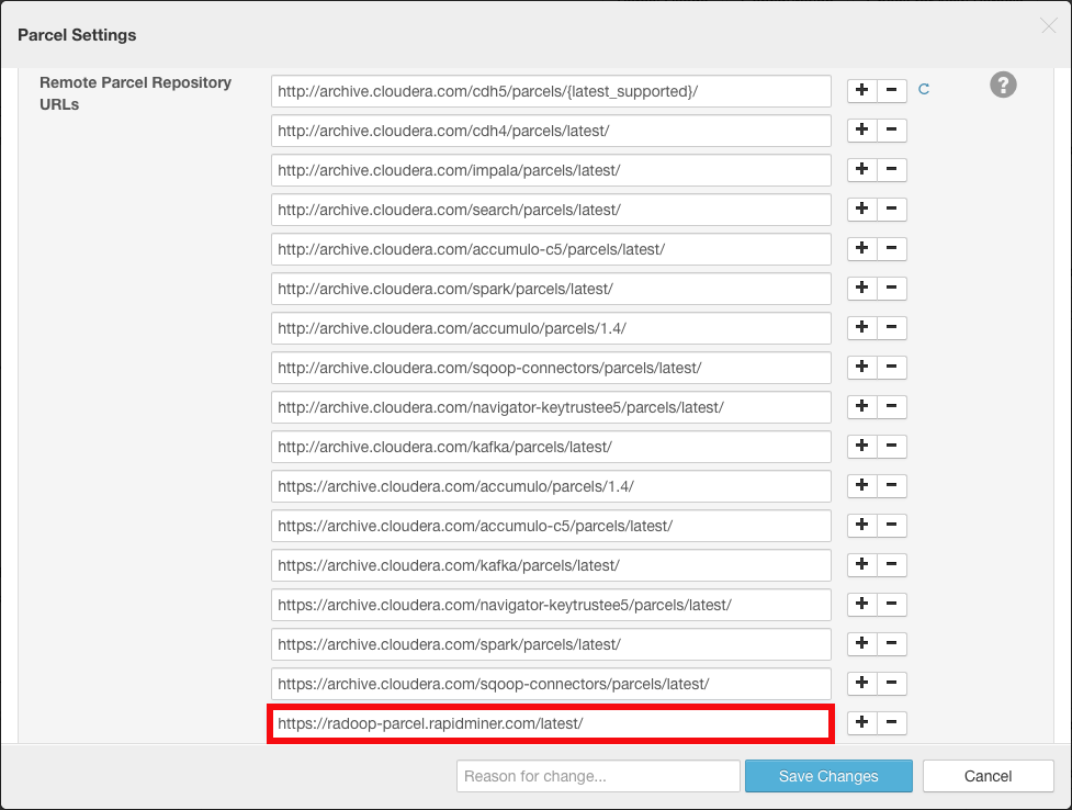 RapidMiner Radoop UDFs are also available inCloudera parcelformat. The parcel can be obtained from the following URLs. Please note that you have to choose the URL based onRapidMiner Studio / Serverversion andnotRadoop extension version.