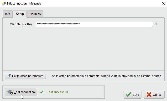 Createand switch to theSetuptab in theEdit connectiondialog.Enter the web service key of your Mozenda user account:
