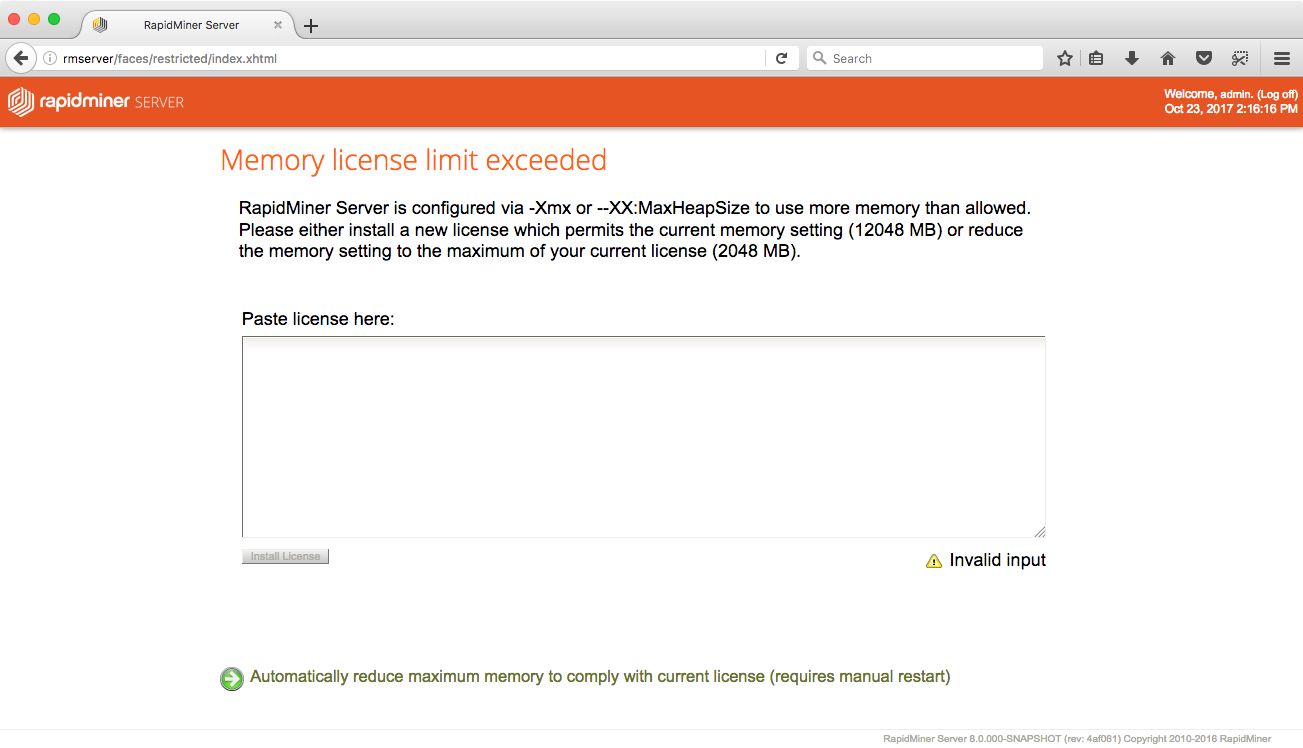 RapidMiner服务器和每个作业容器使用指定数量的内存量。最大内存设置绑定到您的许可证,并在安装期间定义。在RapidMiner服务器的情况下,设置被保存在max-memory.conf文件。如果您启动的RapidMiner服务器的内存设置超过了许可限制,则会显示以下页面。此时,您可以提供适合您需求的许可证,也可以减少内存设置并重新启动RapidMiner Server。