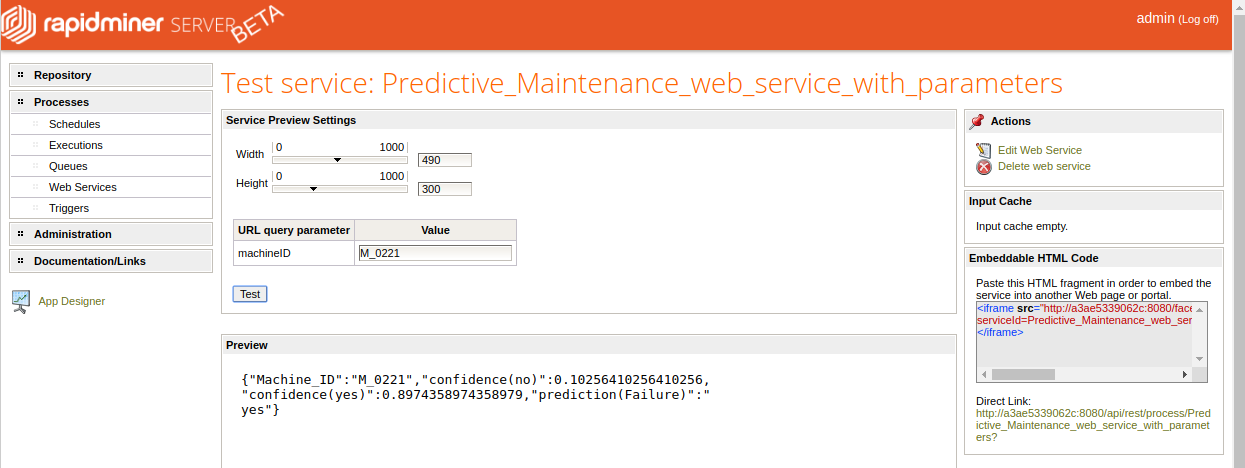 In general,localhostwill be replaced by your RapidMiner Server hostname. Suppose that when creating the web service we had given a simpler name, such as "needs-repair", to the web service ID. Then the URL would have been simpler: