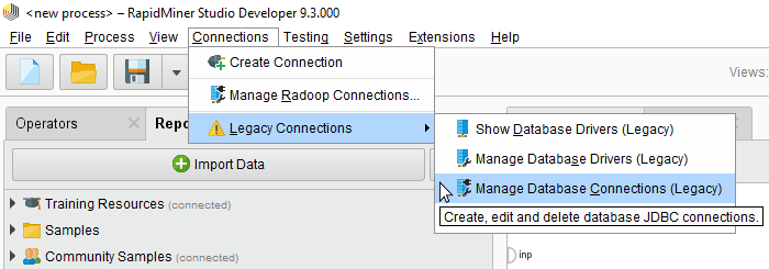 RapidMiner 9.3 introduced a new type of connection management, based onconnection objects. The old connection management will be phased out in future releases. By following the instructions below, you can convert your legacy connections into connection objects. The new connection objects will be saved in a repository.