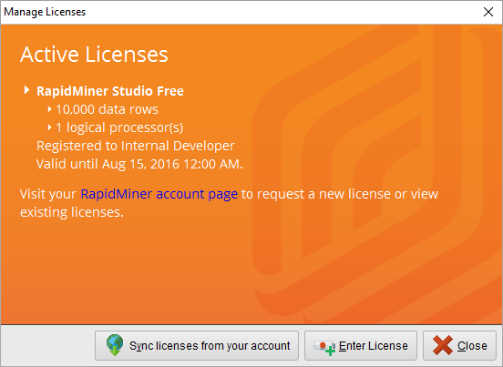RapidMiner Studio附带了一个许可框架。本文将重点解释这些限制以及如何处理它们。安装了Studio之后,您可以使用帮助>管理license菜单中的RapidMiner Studio应用程序。