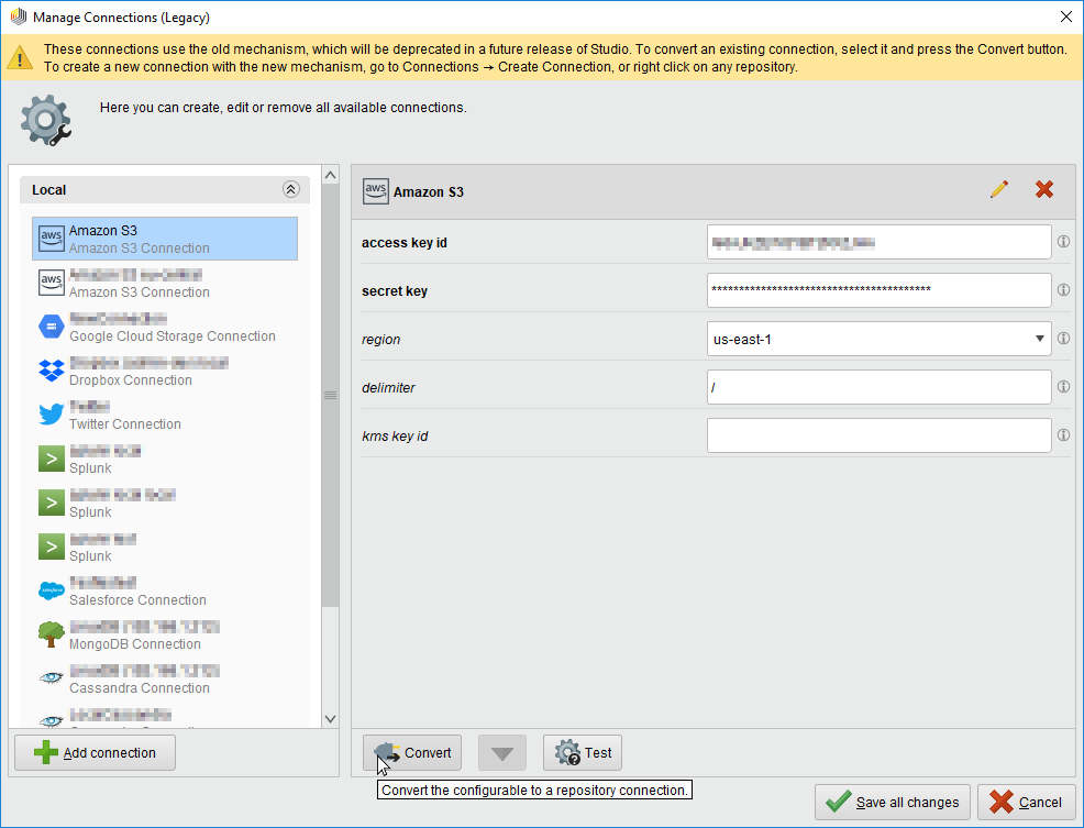 RapidMiner 9.3 introduced a new type of connection management, based onconnection objects. The old connection management will be phased out in future releases. By following the instructions below, you can convert your legacy connections into connection objects. The new connection objects will be saved in a repository.